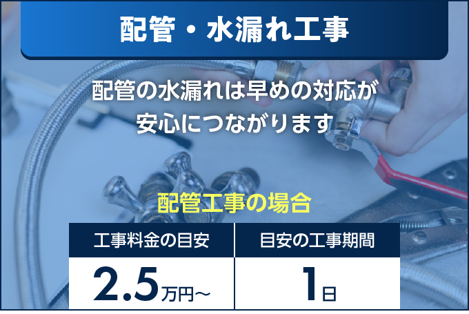 内容によりますが、水栓交換など軽微なものであれば1時間程度、床下の配管修理の場合は半日〜1日程度が目安です。